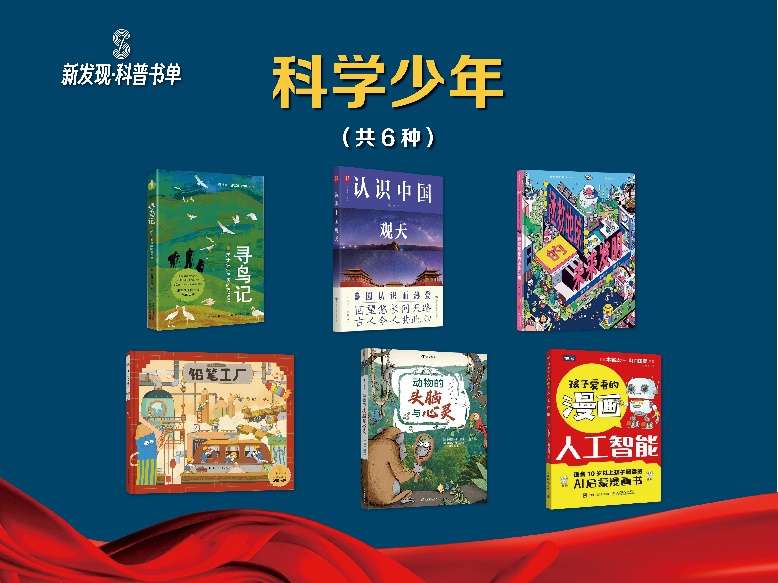 入选本期“科学少年”子书单的图书共6种,包括“图”解人工智能的少儿科普读物《孩子爱看的漫画人工智能》(人民邮电出版社)、讲述一支铅笔奇妙旅程的《铅笔工厂》(中国中福会出版社),以及《拯救地球的未来发明》《寻鸟记》《动物的头脑与心灵》《认识中国观天》。